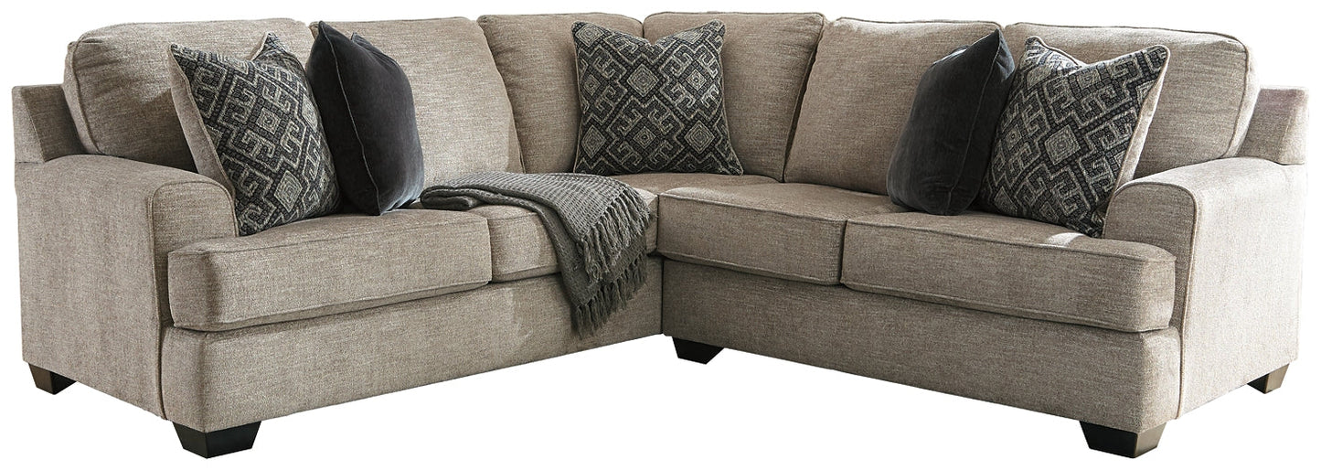 Whether your vision is clean and contemporary or cozy modern farmhouse, this sectional in a stone-tone neutral upholstery has the corner on style. Merging ultimate comfort with striking good looks, this chic sectional includes five coordinating accent pillows for that much more feel-good allure.