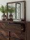 Casual contemporary styling with a decidedly modern vibe. This dresser with mirror is warm and inviting with a rich dark brown finish, adorning your restful retreat with on-trend elegance. Full-length metal pulls in a matte black finish add a subtly cool touch to spacious storage drawers. What a simply stunning way to achieve the bedroom of your dreams.