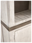 | Details | Made with pine wood, pine veneer and engineered wood, Two-tone finish; distressed weathered gray top with distressed vintage white base, Round metal knob with aged iron-tone finish, 3 open shelves, Cabinet with 1 shelf, Assembly required | |