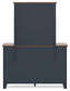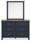| Details | Includes dresser and mirror, Made with hardwood solids, mindi wood veneer and MDF substrates, Two-tone finish features a dark slate blue with light brown wood-tone top, Nickel-tone metal knobs, 6 drawers with fully finished interior, dovetail construction and heavy duty ball-bearing side glides, Mirror attaches to back of dresser | |